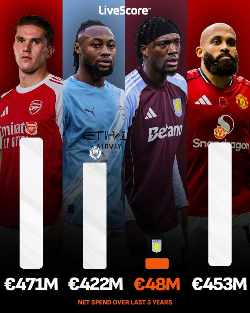 I saw an image on social media comparing net spend over the last three years. Arsenal at €471m. Manchester City at €422m. Manchester United at €453m. And then there was us, Aston Villa, sitting at just €48m. It genuinely got me thinking, what could be if we were really able to spend.